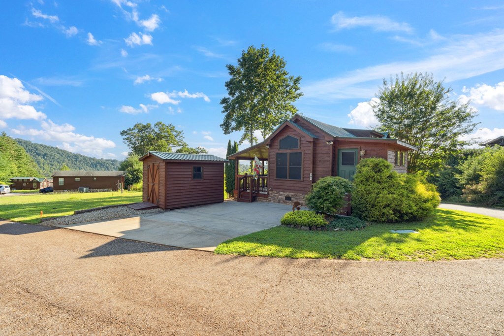 Vacation cabin with a front porch located in the perfect spot to watch the Fall leaf colors or the beautiful sunsets as the sun sinking behind the Southern Appalachian Mountain ridges. AND A GOLF CART TO BOOT!!!! This one bedroom/one bath cabin has an additional bonus room currently used as laundry room. The cabin is equipped with all appliances, furniture, dishes silverware, washer/dryer, king size bed with linens, and is wired for cable/fiber optic and Internet. Within the past two years, updates include new metal roof, complete exterior staining of the cedar exterior walls, complete repainted interior, new toilet, new faucets and stainless kitchen sink. In September 2024, a new 2-ton air conditioner system was installed. Oh yes, don't forget the espresso machine. There is a monthly fee of $125 that covers water, sewer, garbage and lawn mowing. The property includes a wired workshop--perfect for hobbies or extra storage. For an additional $20 a month, you can opt in for access to the extra amenities that owning in Elk Ridge provides. It has a welcoming community feel with the benefit of a clubhouse and pool. Seller is firm on this lower price on this Little Piece of Paradise!