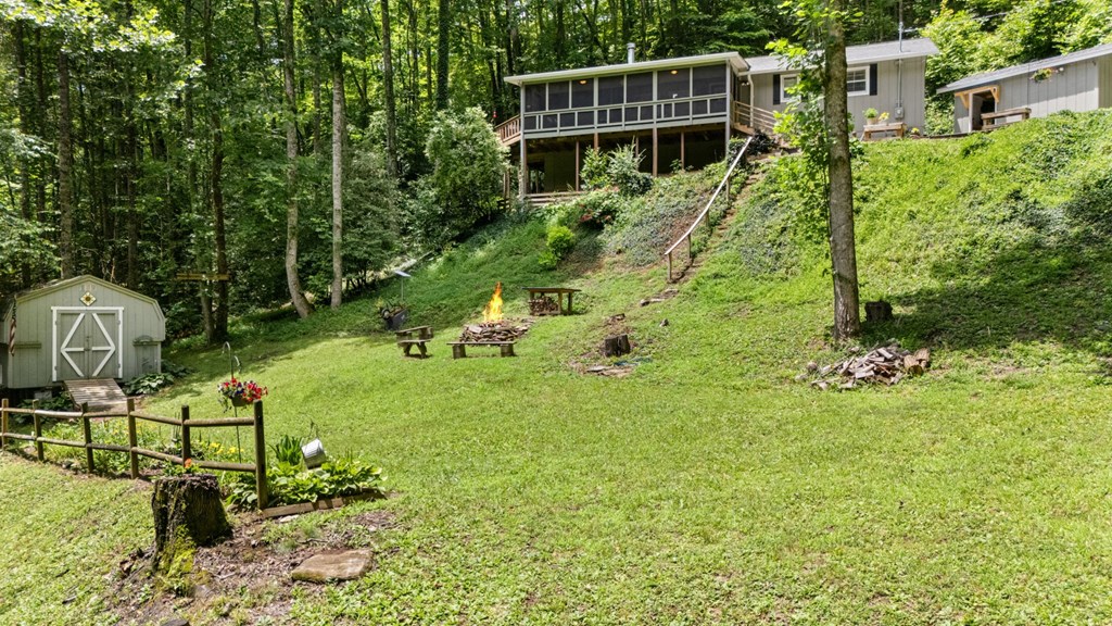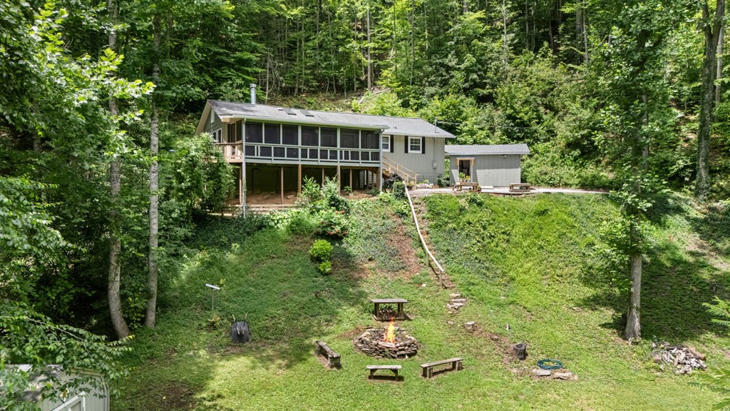 This is your perfect mountain getaway that is on 6.62 private acres. Sit on the screened in porch and listen to the sounds of the nearby mountain stream. The home has been well cared for and has many updates including central heat and air, appliances, screened in porch. The living room has wood floors, a vaulted ceiling with skylights to make it light and bright and an attractive wood burning fireplace. There is a bonus room that has many uses, it has a closet and could be used as an additional sleeping space for vacation renters.. There is a flat yard, great for a garden. Lots of wildlife pass through this property. There are walking trails along 2 ridges and 2 streams. 2 large storage bldgs, both powered, one is fully insulated, drywalled, on a concrete foundation! This property has it ALL!!